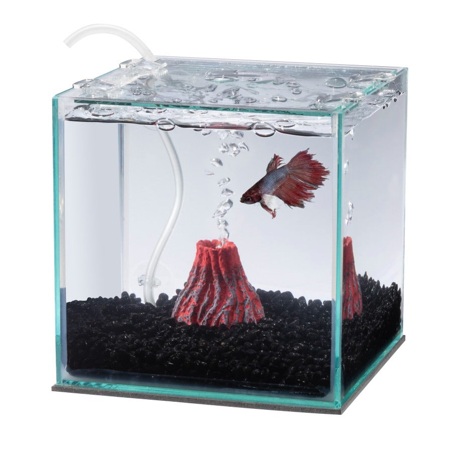 Air operated betta filter with volcano decoration helps improve water quality and clarity for a healthier habitat