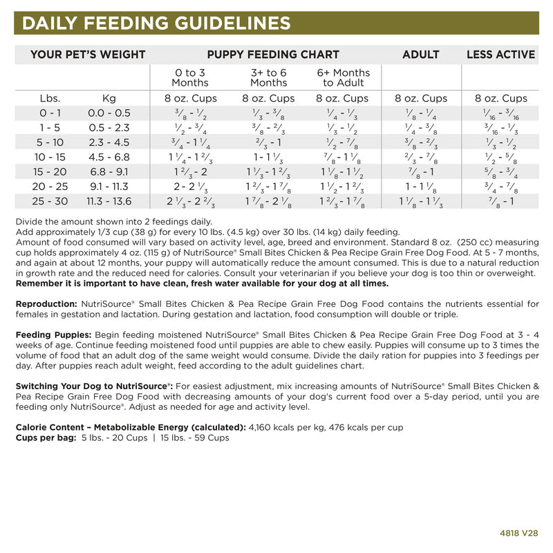 Store in a cool dry place. Your pet's weight: 0-1 lbs (0.0-0.5 kg), Puppy feeding chart: 0 to 3 months 8 oz cups: 3/8-1/2, 3+ to 6 months 8 oz cups: 1/3-3/4, 6+ months to adult o oz cups: 1/4-1/3, Adult: 8 oz cups 1/8-1/4, Less active: 8 oz cups 1/16-3/16; Your pet's weight: 1-5 lbs (0.5-2.3 kg), Puppy feeding chart: 0 to 3 months 8 oz cups: 1/2-3/4, 3+ to 6 months 8 oz cups: 3/8-2/3, 6+ months to adult o oz cups: 2/5-1/2, Adult: 8 oz cups 1/4-3/8, Less active: 8 oz cups 3/16-1/3; Your pet's weight: 5-10 lbs (2.3-4.5 kg), Puppy feeding chart: 0 to 3 months 8 oz cups: 3/4-1 1/4, 3+ to 6 months 8 oz cups: 2/3-1, 6+ months to adult o oz cups: 1/2-2/8, Adult: 8 oz cups 3/8-2/3, Less active: 8 oz cups 1/3-1/2; Your pet's weight: 10-15 lbs (4.5-6.8 kg), Puppy feeding chart: 0 to 3 months 8 oz cups: 1 1/4-1 2/3, 3+ to 6 months 8 oz cups: 1-1 1/3, 6+ months to adult o oz cups: 7/8-1 1/8, Adult: 8 oz cups 2/3-7/8, Less active: 8 oz cups 1/2-5/8; Your pet's weight: 15-20 lbs (6.8-9.1 kg), Puppy feeding chart: 0 to 3 months 8 oz cups: 1 2/3-2, 3+ to 6 months 8 oz cups: 1 1/3-1 2/3, 6+ months to adult o oz cups: 1 1/8-1 1/2, Adult: 8 oz cups 7/8-1, Less active: 8 oz cups 5/8-3/4; Your pet's weight: 20-25 lbs (9.1-11.3 kg), Puppy feeding chart: 0 to 3 months 8 oz cups: 2-2 1/3, 3+ to 6 months 8 oz cups: 1 2/3-1 7/8, 6+ months to adult o oz cups: 1 1/2-1 2/3, Adult: 8 oz cups 1-1 1/8, Less active: 8 oz cups 3/4-7/8; Your pet's weight: 25-30 lbs (11.3-13.6 kg), Puppy feeding chart: 0 to 3 months 8 oz cups: 2 1/3-2 2/3, 3+ to 6 months 8 oz cups: 1 7/8-2 1/8, 6+ months to adult o oz cups: 1 2/3-1 7/8, Adult: 8 oz cups 1 1/8-1 1/3, Less active: 8 oz cups 7/8-1. Divide the amount shown into 2 feedings daily. Add approximately 1/3 cup (38 g) for every 10 lbs. (4.5 kg) over 30 lbs. (14 kg) daily feeding. Amount of food consumed will vary based on activity level, age, breed and environment. Standard 8 oz. (250 cc) measuring cup holds approximately 4 oz. (115 g) of NutriSource Small Bites Chicken & Pea Recipe Grain Free Dog Food. At 5-7 months, and again at about 12 months, your puppy will automatically reduce the amount consumed. This is due to a natural reduction in growth rate and the reduced need for calories. Consult your veterinarian if you believe your dog is too thin or overweight. Remember it is important to have clean, fresh water available for your dog at all times. Reproduction: NutriSource Small Bites Chicken & Pea Recipe Grain Free Dog Food contains the nutrients essential for females in gestation and lactation. During gestation and lactation, food consumption will double or triple. Feeding Puppies: Begin feeding moistened NutriSource Small Bites Chicken & Pea Recipe Grain Free Dog Food at 3-4 weeks of age. Continue feeding moistened food until puppies are able to chew easily. Puppies will consume up to 3 times the volume of food that an adult dog of the same weight would consume. Divide the daily ration for puppies into 3 feedings per day. After puppies reach adult weight, feed according to the guidelines chart. Switching Your Dog to NutriSource: For easiest adjustment, mix increasing amounts of NutriSource Small Bites Chicken & Pea Recipe Grain Free Dog Food with decreasing amounts of your dog's current food over a 5-day period, until you are feeding only NutriSource. Adjust as needed for age and activity level. Approximate Cups per Bag: 4 lbs - 15 cups; 12 lbs - 47 cups.