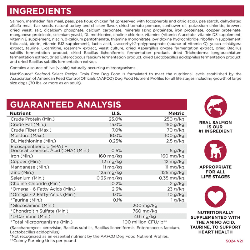 Health & happiness start in the gut – our specialty. At family-owned NutriSource, we believe the secret to health is successful digestion and absorption of balanced nutrition. That’s why we focus on supporting the gut microbiome with our proprietary blend of prebiotics, probiotics, trace minerals and selenium yeast. We call our gut-focused proprietary blend Good4Life because these ingredients nourish the gut microbiome, building the ultimate foundation for a long and happy life. Scientifically formulated, NutriSource Seafood Select Recipe Grain Free Dog Food includes a blend of salmon, carefully selected ingredients, and Good4Life to provide essential nutrients for optimum health and long life. Feed with confidence knowing that you’re part of a family that loves your pets just as much as you do. Health begins here.