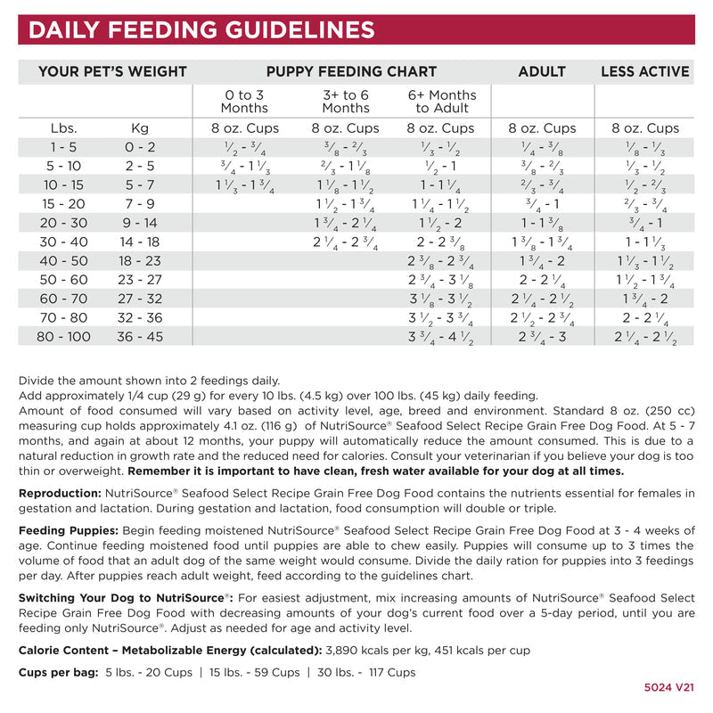 Store in a cool, dry place. Daily Feeding Guidelines: Your Pet's Weight (Lbs. 1-5, kg 0-2): Puppy feeding chart (0 to 3 months) (8 oz cup) = 1/2 - 3/4; Puppy feeding chart (3+ to 6 months) (8 oz cup) = 3/8 - 2/3; Puppy feeding chart (6+ months to adults) (8 oz cup) = 1/3 - 1/2; Adult (8 oz. cups) = 1/4 - 3/8; Less Active (8 oz cups) = 1/8 - 1/3. Your Pet's Weight (Lbs. 5-10, kg 2-5): Puppy feeding chart (0 to 3 months) (8 oz cup) = 3/4 - 1-1/3; Puppy feeding chart (3+ to 6 months) (8 oz cup) = 2/3 - 1-1/8; Puppy feeding chart (6+ months to adults) (8 oz cup) = 1/2 - 1; Adult (8 oz. cups) = 3/8 - 2/3; Less Active (8 oz cups) = 1/3 - 1/2. Your Pet's Weight (Lbs. 10-15, kg 5-7): Puppy feeding chart (0 to 3 months) (8 oz cup) = 1-1/3 - 1-3/4; Puppy feeding chart (3+ to 6 months) (8 oz cup) = 1-1/8 - 1-1/2; Puppy feeding chart (6+ months to adults) (8 oz cup) = 1 - 1-1/4; Adult (8 oz. cups) = 2/3 - 3/4; Less Active (8 oz cups) = 1/2 - 2/3. Your Pet's Weight (Lbs. 15-20, kg 7-9): Puppy feeding chart (3+ to 6 months) (8 oz cup) = 1-1/2 - 1-3/4; Puppy feeding chart (6+ months to adults) (8 oz cup) = 1-1/4 - 1-1/2; Adult (8 oz. cups) = 3/4 - 1; Less Active (8 oz cups) = 2/3 - 3/4. Your Pet's Weight (Lbs. 20-30, kg 9-14): Puppy feeding chart (3+ to 6 months) (8 oz cup) = 1-3/4 - 2-1/4; Puppy feeding chart (6+ months to adults) (8 oz cup) = 1-1/2 - 2; Adult (8 oz. cups) = 1 - 1-3/8; Less Active (8 oz cups) = 3/4 - 1. Your Pet's Weight (Lbs. 30-40, kg 7-9): Puppy feeding chart (3+ to 6 months) (8 oz cup) = 2-1/4 - 2-3/4; Puppy feeding chart (6+ months to adults) (8 oz cup) = 2 - 2-3/8; Adult (8 oz. cups) = 1-3/8 - 1-3/4; Less Active (8 oz cups) = 1 - 1-1/3. Your Pet's Weight (Lbs. 40-50, kg 18-23): Puppy feeding chart (6+ months to adults) (8 oz cup) = 2-3/8 - 2-3/4; Adult (8 oz. cups) = 1-3/4 - 2; Less Active (8 oz cups) = 1-1/3 - 1-1/2. Your Pet's Weight (Lbs. 50-60, kg 23-27): Puppy feeding chart (6+ months to adults) (8 oz cup) = 2-3/4 - 3-1/8; Adult (8 oz. cups) = 2 - 2-1/4; Less Active (8 oz cups) = 1-1/2 - 1-3/4. Your Pet's Weight (Lbs. 60-70, kg 27-32): Puppy feeding chart (6+ months to adults) (8 oz cup) = 2-3-1/8 - 3-1/2; Adult (8 oz. cups) = 2-1/4 - 2-1/2; Less Active (8 oz cups) = 1-3/4 - 2. Your Pet's Weight (Lbs. 70-80, kg 32-36): Puppy feeding chart (6+ months to adults) (8 oz cup) = 3-3/4 - 4-1/2; Adult (8 oz. cups) = 2-3/4 - 3; Less Active (8 oz cups) = 2-1/4 - 2-1/2. Divide the amount shown into 2 feedings daily. Add approximately 1/4 cup (29 g) for every 10 lbs. (4.5 kg) over 100 lbs. (45 kg) daily feeding. Amount of food consumed will vary based on activity level, age, breed and environment. Standard 8 oz (250 cc) measuring cup holds approximately 4.4 oz. (125 g) of Nutrisource seafood select recipe grain free dog food. At 5-7 months, and again at about 12 months, your puppy will automatically reduce the amount consumed. This is due to a natural reduction in growth rate and the reduced need for calories. Consult your veterinarian if you believe your dog is too thin or overweight. Remember it is important to have clean, fresh water available for your dog at all times. Reproduction: Nutrisource Seafood Select Recipe Grain-Free Dog Food contains the essential nutrients essential for females in gestation and lactation. During gestation and lactation, food consumption will double o triple. Feeding puppies: Begin feeding moistened Nutrisource Seafood Select recipe, grain-free dog food at 3 - 4 weeks of age. Continue feeding moistened food until puppies are able to chew easily. Puppies will consume up to 3 times the volume of food that an adult dog of the same weight would consume. Divide the daily ration for puppies into 3 feedings per day. After puppies reach adult weight, feed according to the adult guidelines chart. Switching your dog to Nutrisource: for easiest adjustment, mix increasing amounts of Nutrisource seafood select recipe grain free dog food with decreasing amounts of your dog's current food over a 5-day period, until you are feeding only Nutrisource. Adjust as needed for age and activity level. Approximate Cups per Bag: 4 lbs - 14 cups; 12 lbs - 43 cups; 26 lbs - 94 cups.
