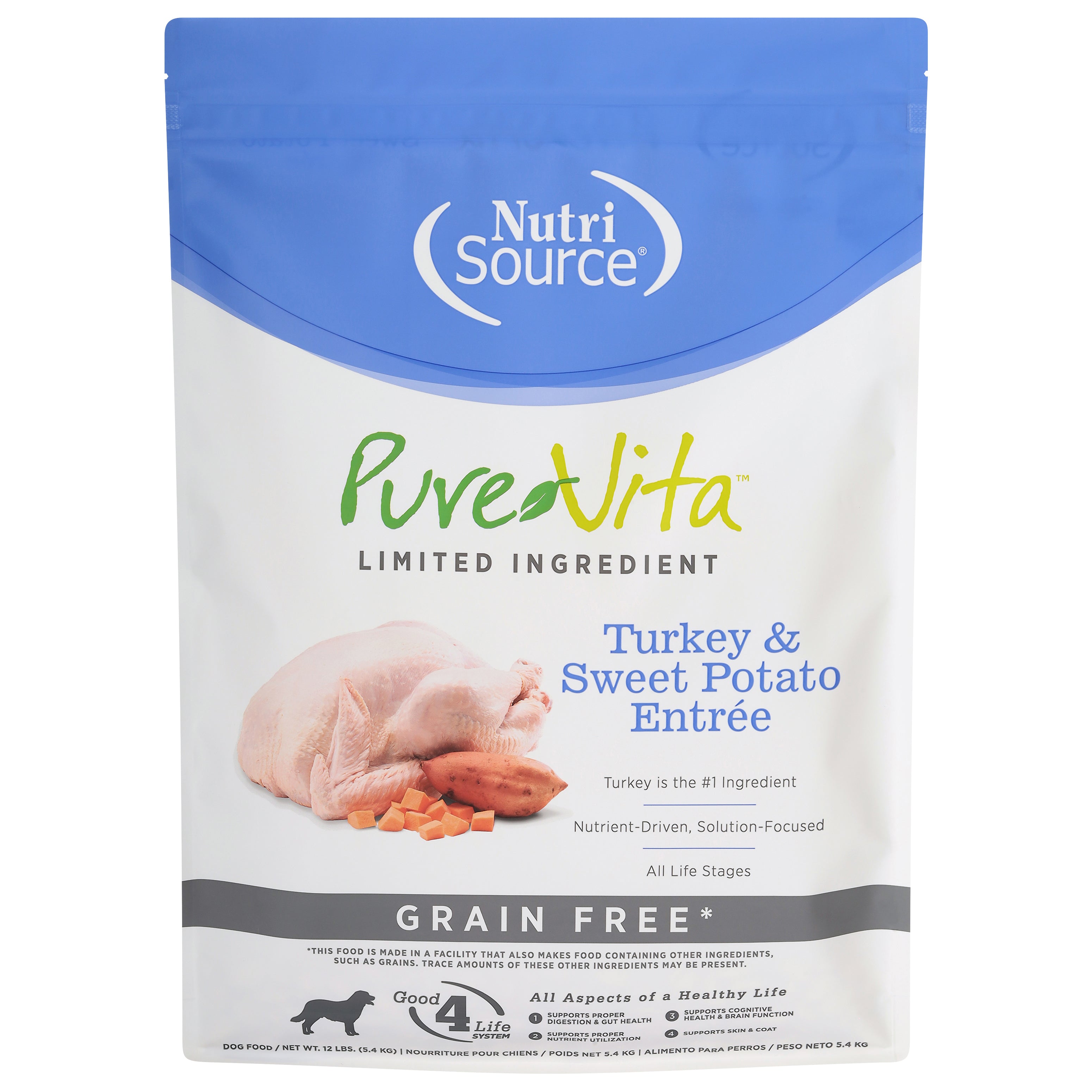 PureVita™ Grain Free Turkey & Sweet Potato Formula with Sweet Potatoes and Peas combines tasty turkey with wholesome sweet potatoes and peas as well as a select variety of fruits to deliver a healthy and delicious, easy to digest meal your dog will love. And because it is made by NutriSource® you can be sure that it is formulated and produced with care using the finest quality ingredients from our family to yours.