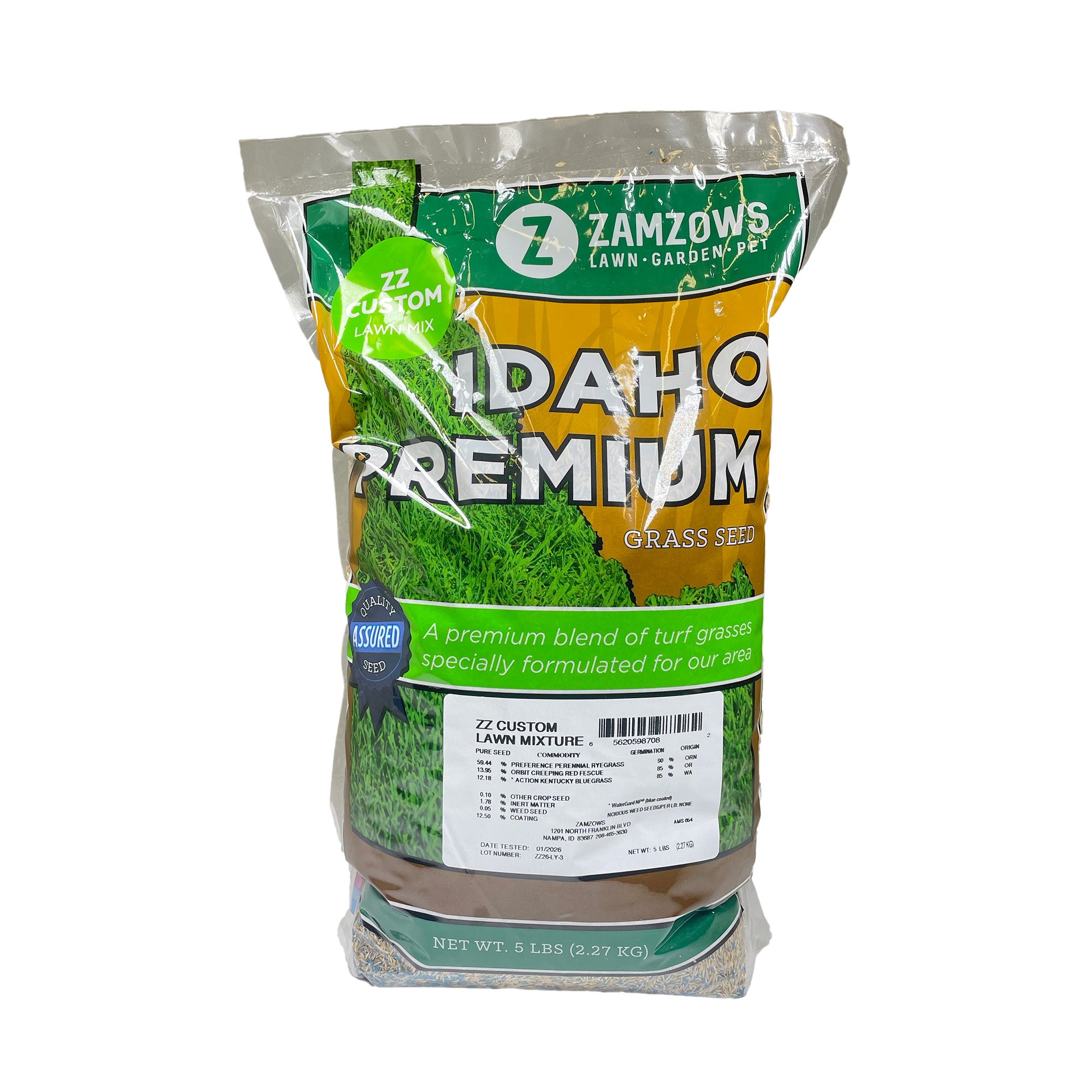 What sets Zamzows Custom Lawn Mix apart are the exceptional seed varieties in the blend, each chosen for their outstanding performance in Idaho's unique climate. The mixture contains 58% Perennial Rye Grass, known for its durability and quick establishment. Additionally, it includes 12.05% Kentucky Blue Grass, which adds a beautiful, dense texture to your lawn, and 7.10% Creeping Red Fescue, providing excellent tolerance to shade and drought.